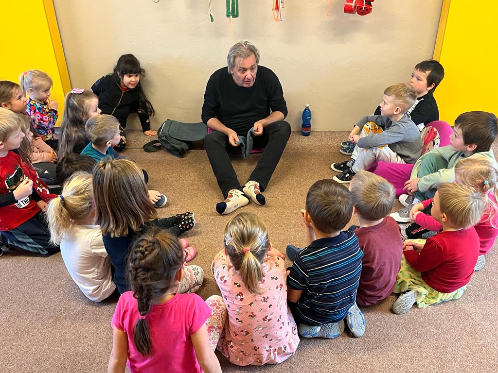 Známý moderátor a bavič názornou ukázkou vedl děti k mrštnosti jazýčků, ke gymnastice mluvidel, ale také k pohybovým činnostem. Pan Boura vyvolal svým přístupem u všech dětí nadšení, aktivitu a dobrou náladu. Děkujeme za prima dopoledne.